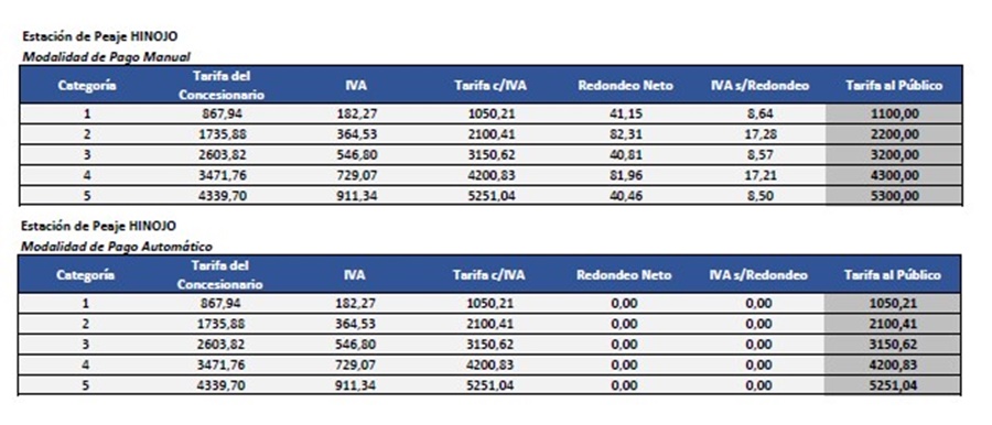 A partir del miércoles aumenta el Peaje de hinojo, el gobierno a través de la Dirección Nacional de Vialidad, publicó este lunes en el Boletín Oficial los nuevos cuadros tarifarios para los peajes.