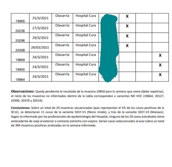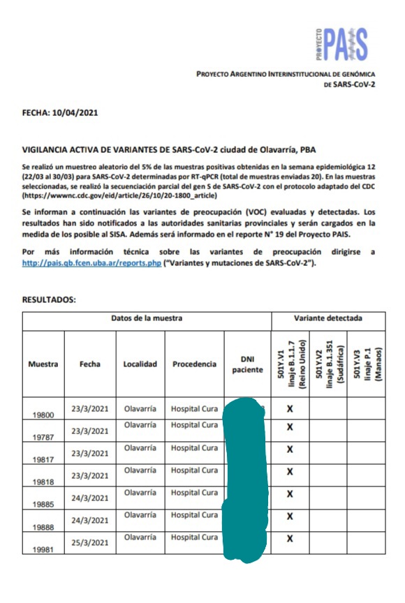 Dichas muestras se envían periódicamente pero fundamentalmente durante los brotes .Ante el último brote registrado en nuestra ciudad se enviaron numerosas muestras las cuales arrojaron los siguientes resultados:58% variante genética Uk ( del Reino Unido ), 16%variante Manaos y 26% variantes de no interés.