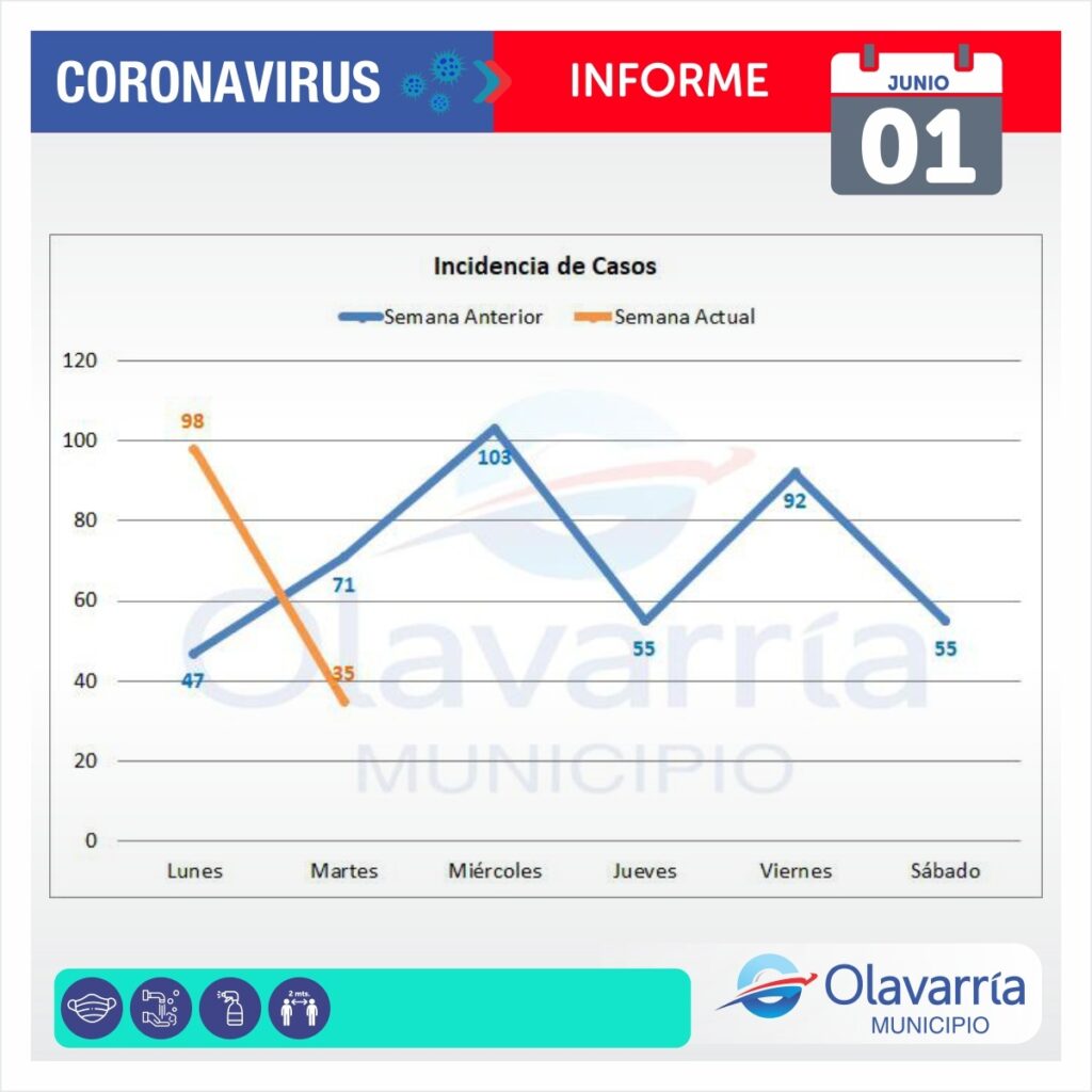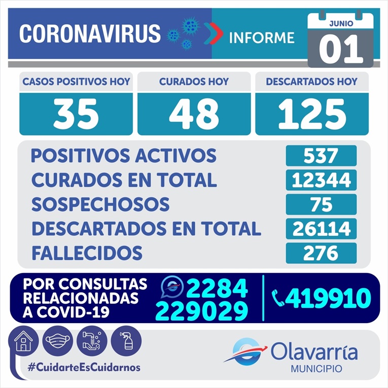 En la fecha de hoy 1 de junio se registraron 35 casos positivos, 48 altas médicas y 125 descartados.