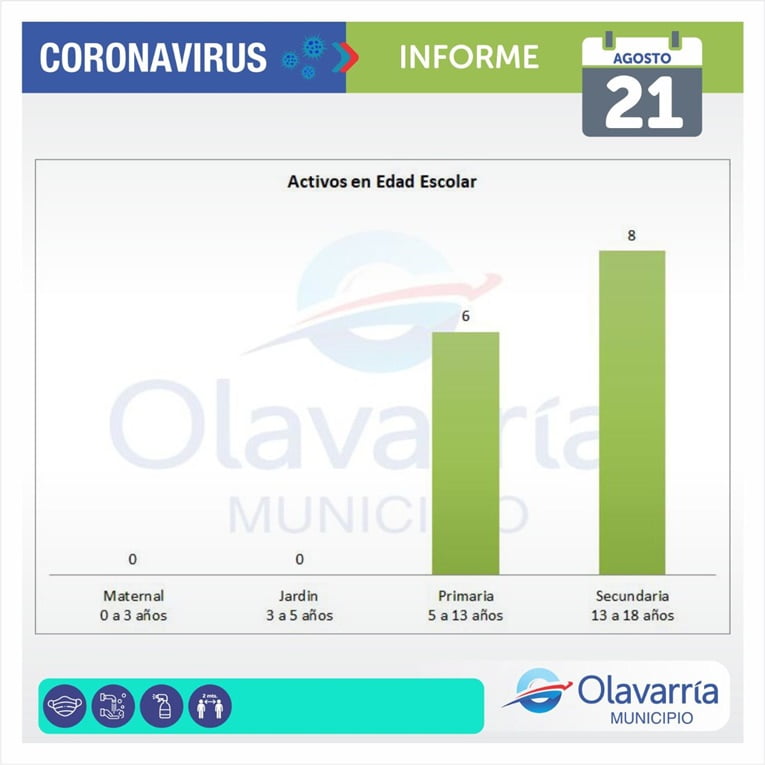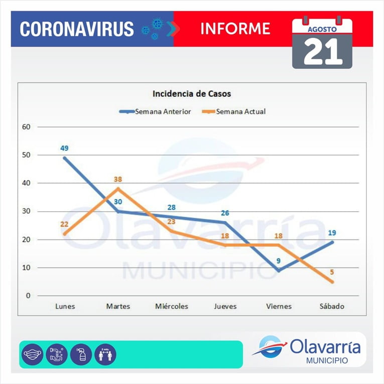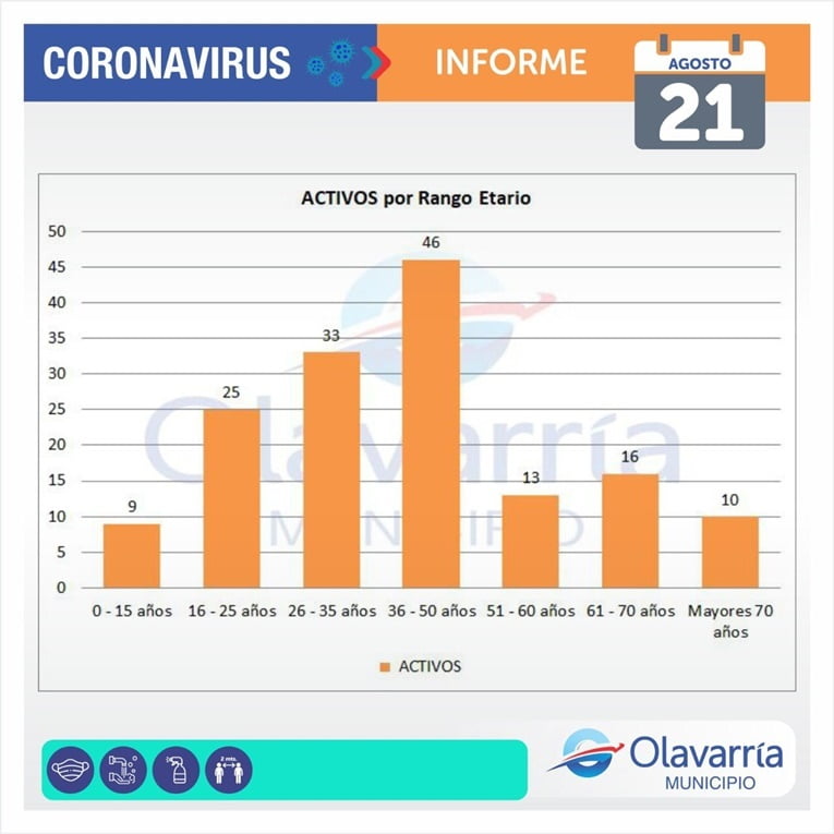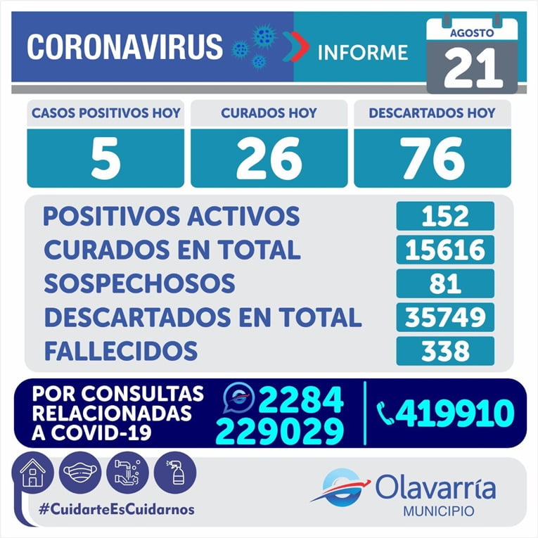Este sábado 21 de agosto se registraron 5 casos positivos, 26 altas médicas y 76 descartados.