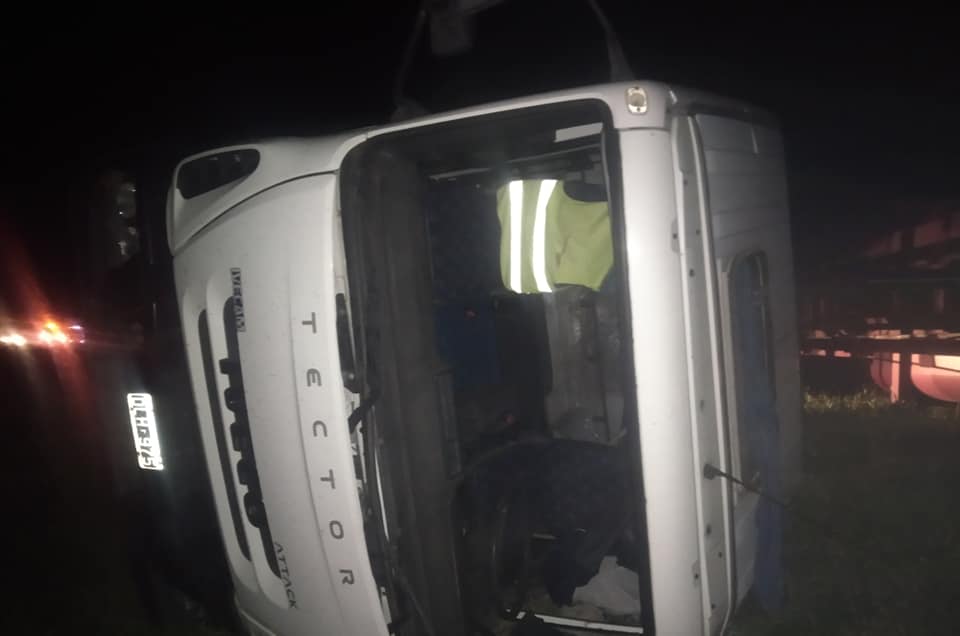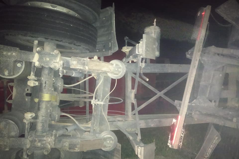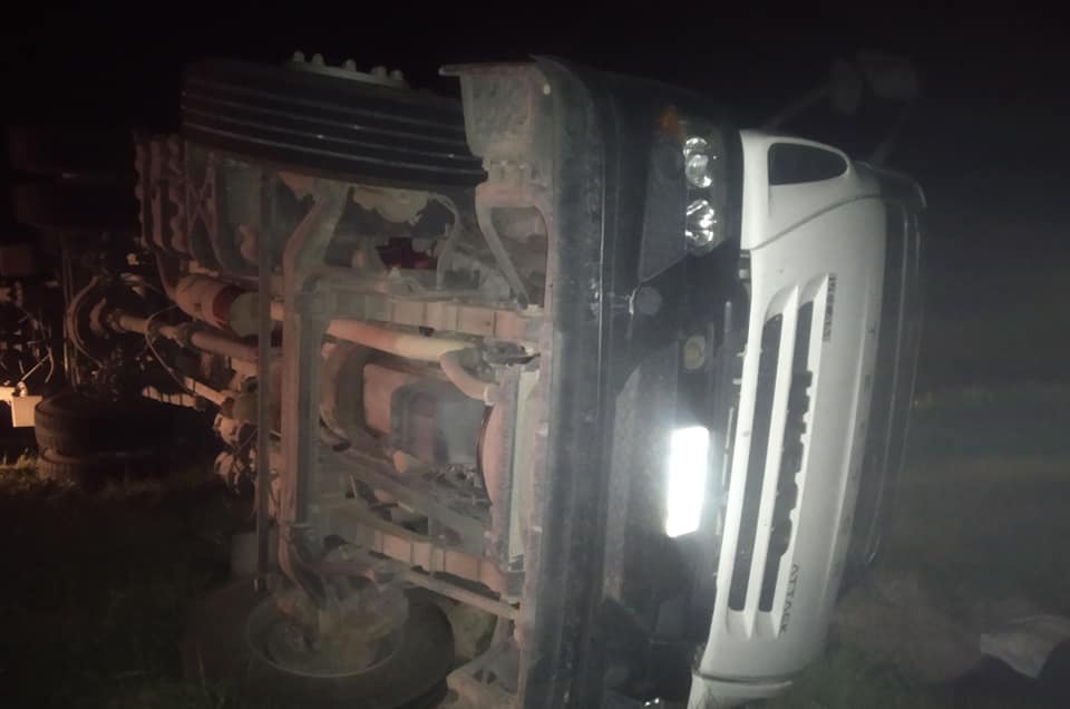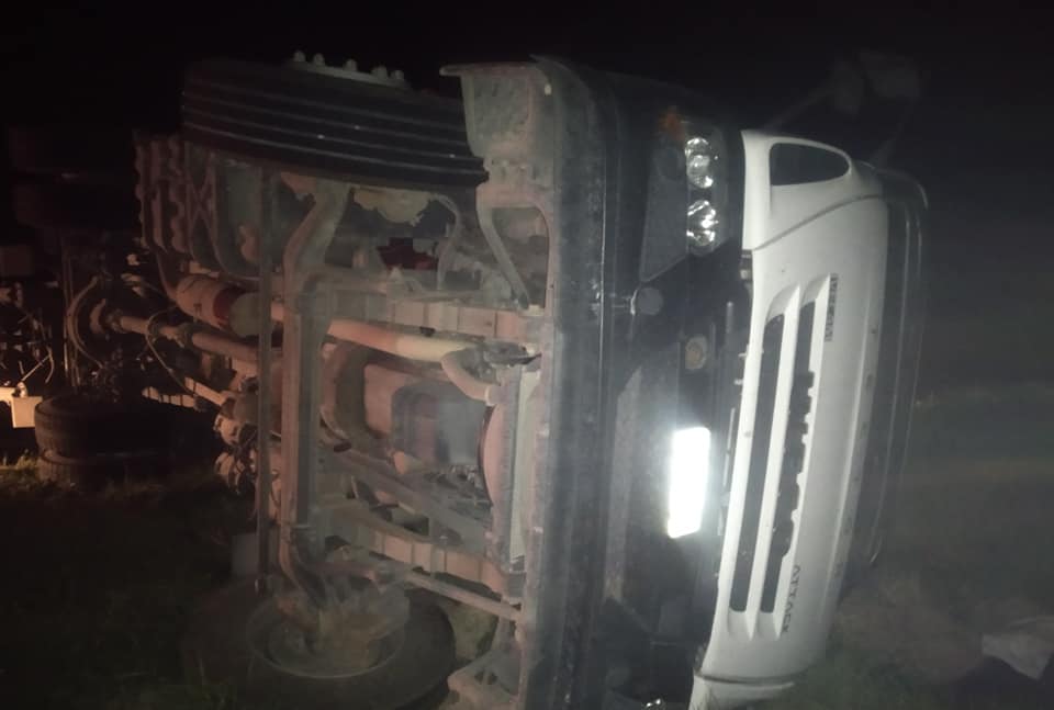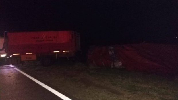 Por causas que se tratan de establecer el camión conducido por el Olavarriense, se, cruza de carril provocando que el otro al esquivarlo pierda el control, volcando ambos camiones y obstaculizando parte de la ruta y la banquina. –