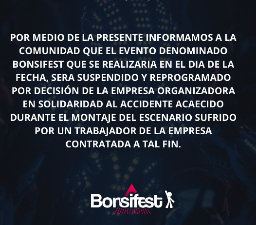 Por un accidente laboral se suspendió la Bonsifest, el hecho ocurrió en la tarde de este sábado, desde la organización emitieron un comunicado a través de sus redes sociales.