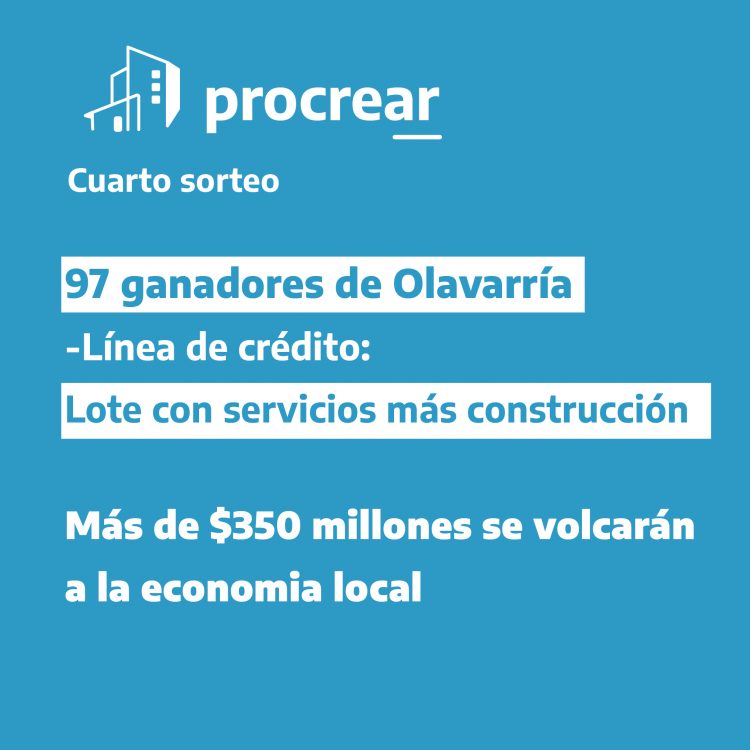 «Felicitaciones a los 97 olavarrienses ganadores del sorteo #ProCreAr que accedieron a la línea Lote con Servicio para la construcción de viviendas. Más de $350 millones se volcarán a la economía local, generando trabajo y cumpliendo el sueño de la casa propia.»