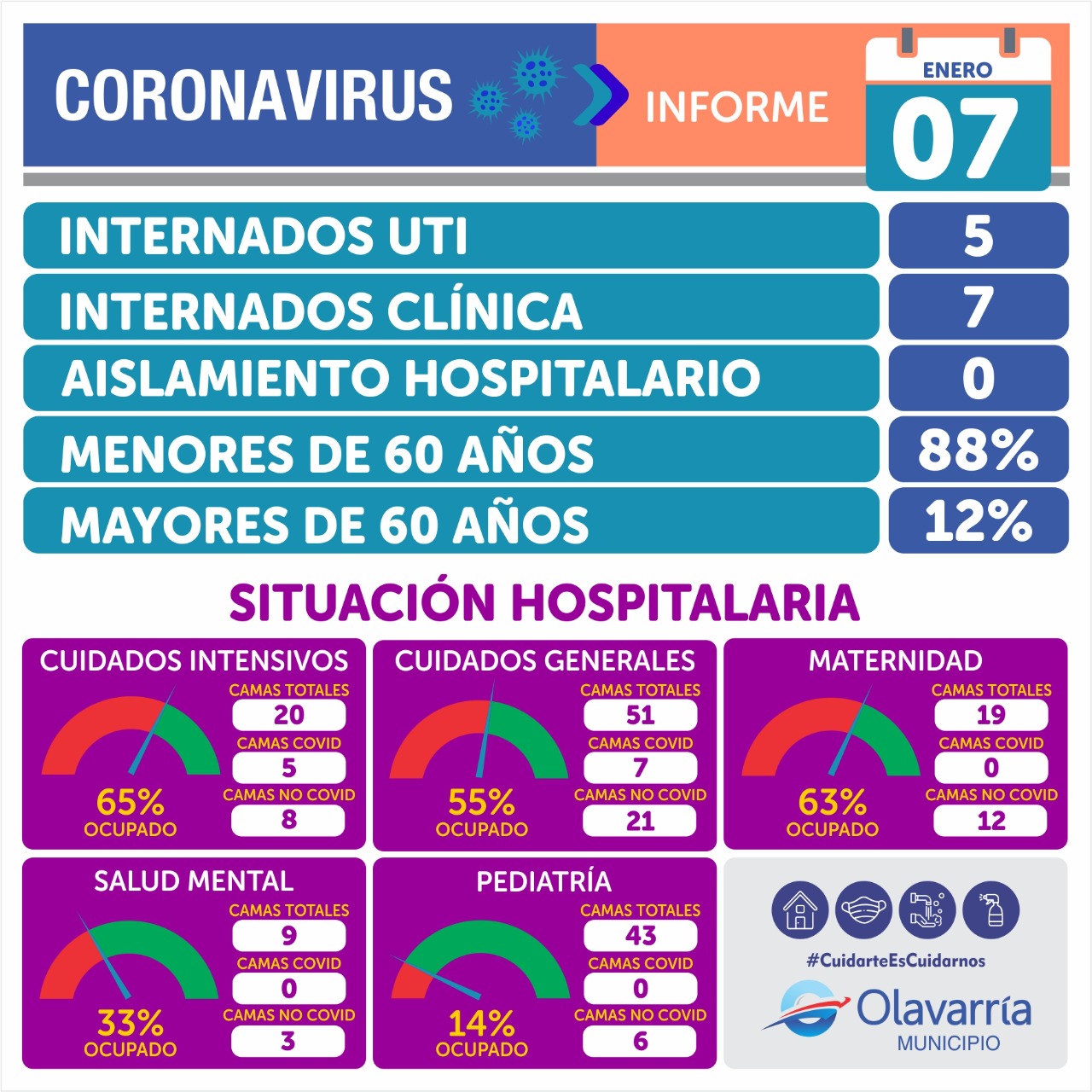 Sobre el estado actual del Hospital Municipal “Dr. Héctor Cura”, se indicó que hay cinco pacientes en Unidad de Terapia Intensiva y siete en Cuidados Generales. No hay internados en el sector de Pediatría.