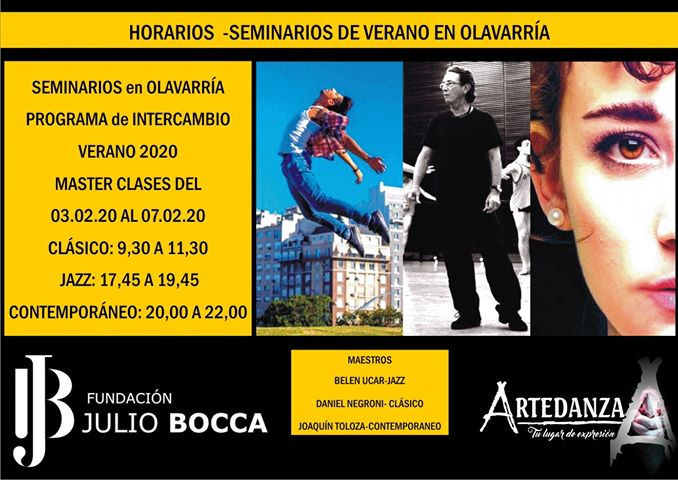 La primera semana de febrero, desde el día Lunes 3 hasta el día Viernes 7, se dictarán Seminarios de danza a cargo de los Maestros de la Fundación Julio Bocca, Daniel Negroni en Clásico, Belén Ucar en Jazz y Joaquín Toloza en Contemporáneo. Los mismos constan de tres Máster Clases por día de dos horas de duración cada una.