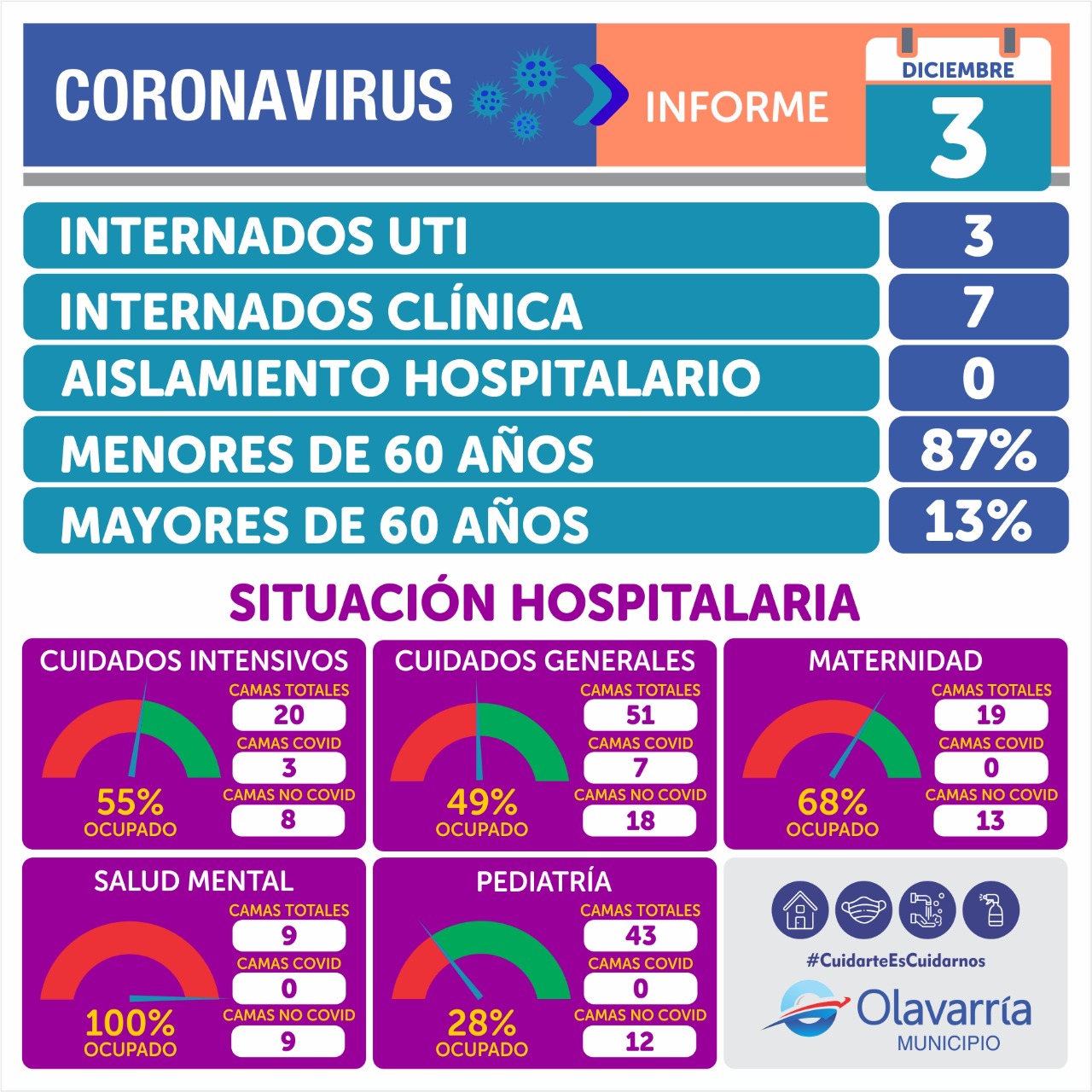 Sobre el estado actual del Hospital Municipal “Dr. Héctor Cura”, se indicó que hay tres pacientes en Unidad de Terapia Intensiva y siete en Cuidados Generales. No hay internados en el sector de Pediatría.